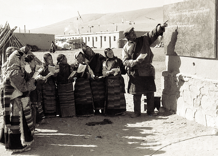 這是班戈縣小學校長申卻堅村在給學生上課(唐召明1987年攝)