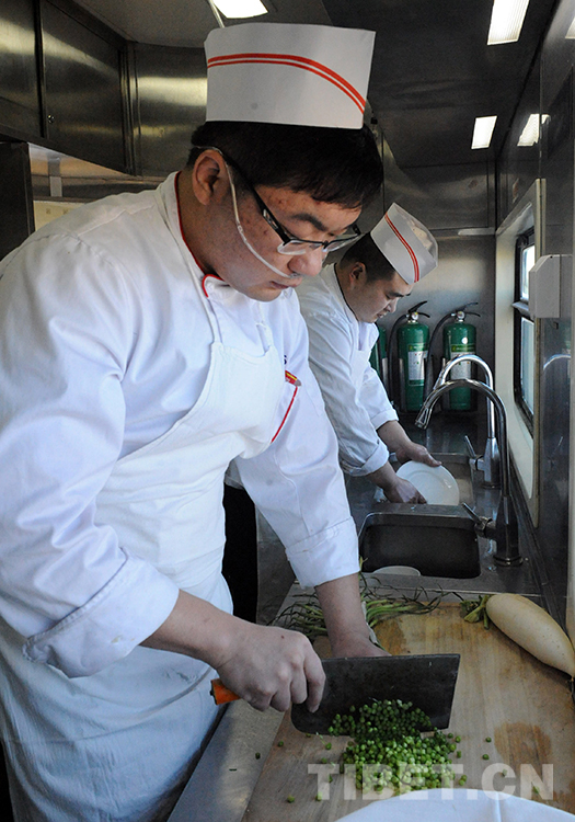 我在北京鐵路客運段京藏列車第二組的餐車里看到,列車在通過唐古拉山區段時,餐車正在為旅客提供炒菜服務。我采訪的廚師長孫冠軍告訴我,京藏列車自開通運營以來,除了像西紅柿炒雞蛋因高原沸點低而無法炒成片外,其他三四十種可口飯菜都能在列車運行中的高海拔地段完成。