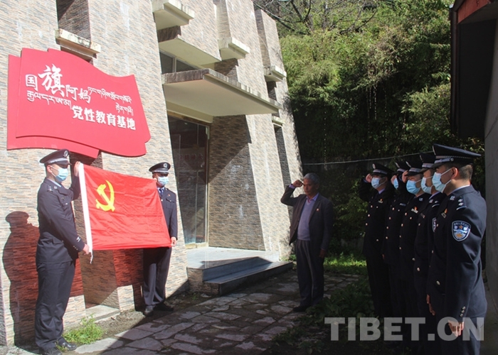 圖為民警在樟木鎮國旗阿媽黨性教育基地前重溫入黨誓詞
