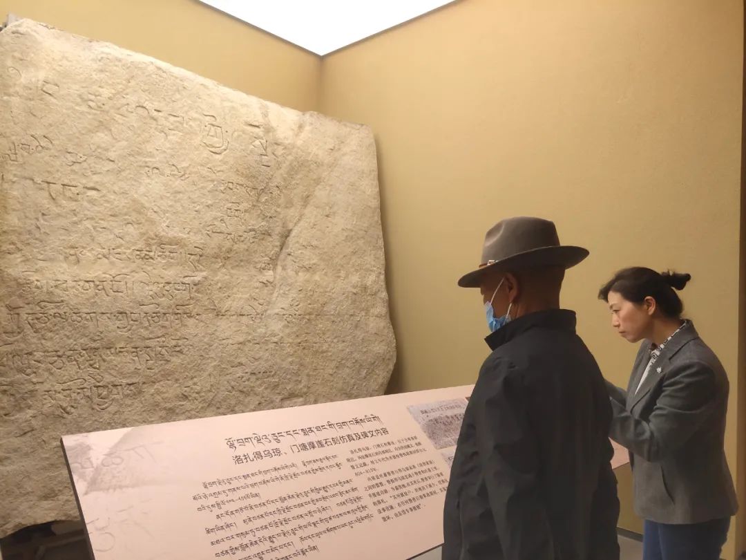 圖為參觀者在山南市博物館駐足了解洛扎得烏窮、門塘摩崖石刻內容 圖片來源:西藏商報
