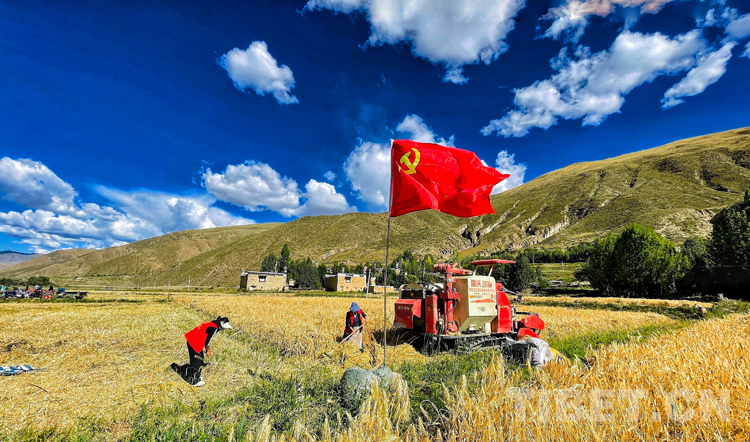 圖為瓊結縣拉玉鄉黨員志愿先鋒隊在該鄉強吉村二組幫助村民收青稞。多吉攝
