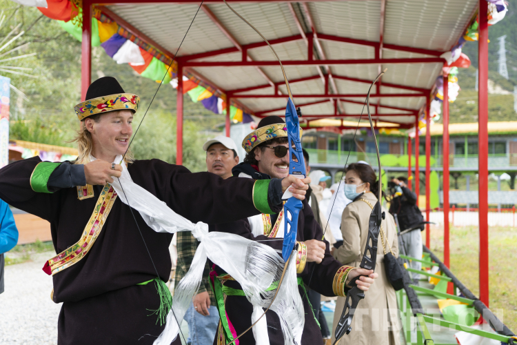 身著工布藏裝的澳大利亞籍五指山1867洲際自行車隊隊員Oliver Anderson正在和身邊的隊友進行響箭比賽。在身邊藏族村民的幫助下,Oliver Anderson的箭術越來越準,每射出一支響箭,兩位外籍運動員都因這種體育項目的獨特魅力而歡呼、擊掌。提起林芝這座城市,Oliver Anderson說:“林芝是一座非常美麗的城市,這里的天氣非常舒適,也使自己比賽狀態非常好。西藏是一處越來越開放的地方,這次能來西藏參加比賽非常榮幸。”