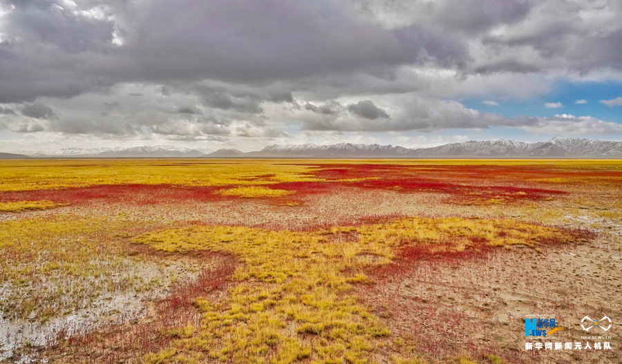 冬格措納湖位于青海省果洛藏族自治州瑪多縣境內,海拔4000米以上。秋日的冬格措納湖,湖水湛藍、天空遼闊,湖畔的草地紅綠黃交融,一幅大自然的美麗畫卷在這里展開。新華網 宋忠勇 攝