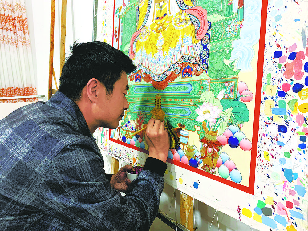 隨著熱貢唐卡知名度的不斷提高,越來越多的唐卡藝人依靠繪制唐卡的技能,獲得穩定收入。