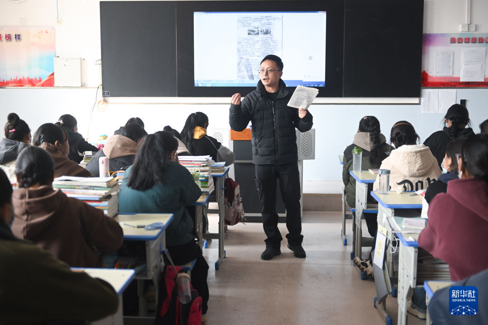 2023年2月23日,援青教師鐘祖華在青海省西寧市城北區的西寧果洛中學給學生上課。新華社記者 張龍 攝